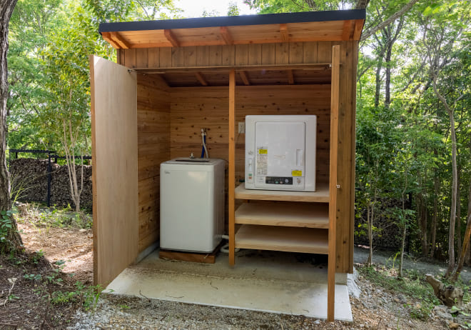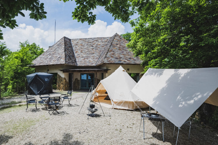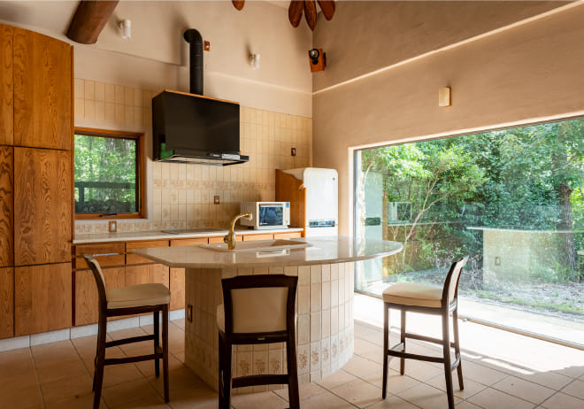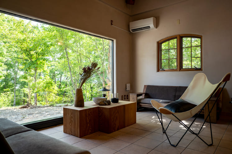 拠点となるコテージは、浜松で話題の観光スポット「ぬくもりの森」の設計を手がけた故・ 佐々木茂良氏のデザイン。彼の遊び心が詰まった建築は、いつの日か、密かに思い描いた秘密基地の設計図を具現化したよう。森の中でも快適に過ごすためのスペックを整え、自邸のようにのびのびとくつろげる空間を実現しました。