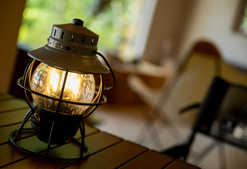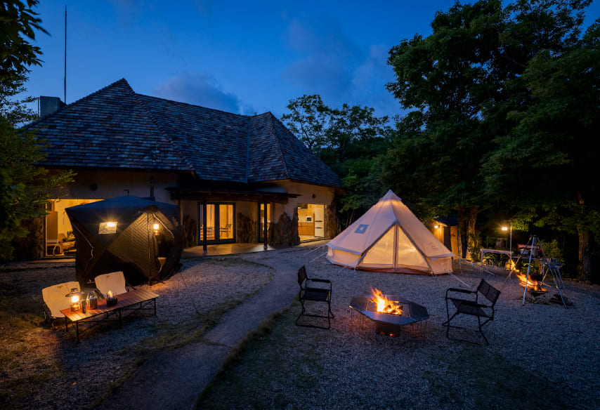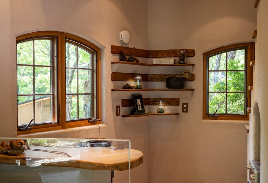 拠点となるコテージは、浜松で話題の観光スポット「ぬくもりの森」の設計を手がけた故・ 佐々木茂良氏のデザイン。彼の遊び心が詰まった建築は、いつの日か、密かに思い描いた秘密基地の設計図を具現化したよう。森の中でも快適に過ごすためのスペックを整え、自邸のようにのびのびとくつろげる空間を実現しました。